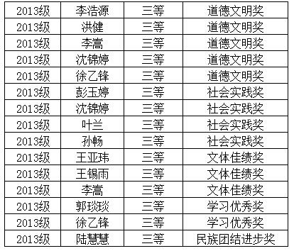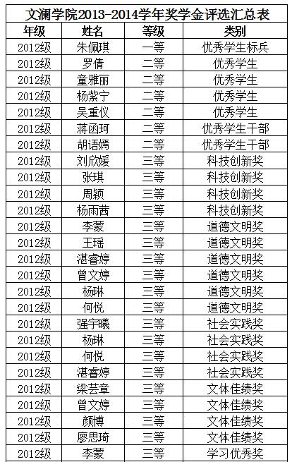 根据学工部下发的《关于开展本科生2013-2014学年鉴定和评优工作的通知》、《米兰电竞·(中国区)学生奖励办法》以及《米兰电竞·(中国区)文澜学院2013—2014年奖学金评比条件附则》等文件精神,经过个人申请、班级民主评议、学院审核,决定授予朱佩琪等2人为2013-2014学年度优秀学生标兵,获一等人民奖学金;授予罗倩等13人为优秀学生干部、优秀学生,获二等人民奖学金;授予刘欣媛等40人次道德文明等奖项,获三等人民奖学金。现将我院2013-2014学年校园人民奖学金获得者名单予以公示,所获奖项须报经学校审定后有效。