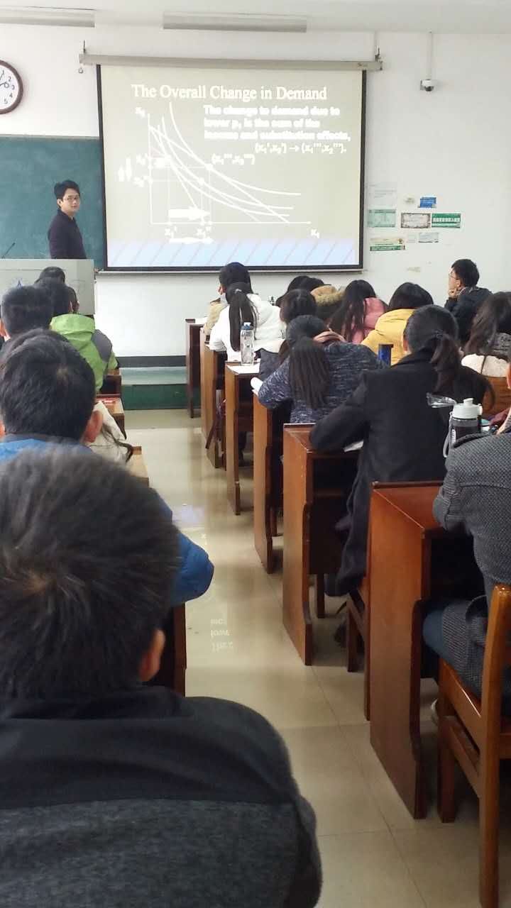 讲座结束后,帅老师向大一学生“摸底”,表示自己会在12月份给新生们上《微观经济学》这门课。他希望同学们在课后加强练习,才能把基础打牢。