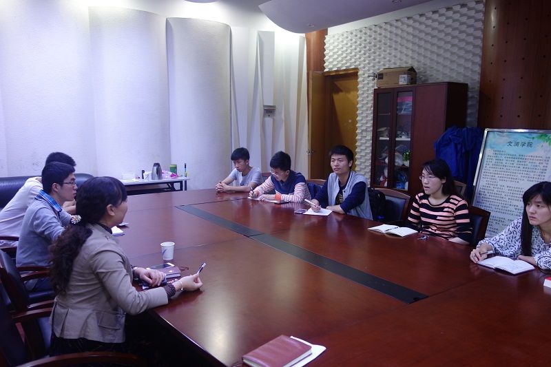 文澜学院学生工作座谈会于2016年4月28日中午在文澜楼105会议室举行。会议由丁奕书记主持,辅导员余利和包含班干部、党员在内的8名学生代表参加了此次座谈会。