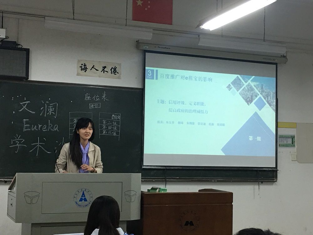 一开场,主持人先介绍了Eureka成立背景、组织架构。名字来由等,加深大家的认同感;紧接着介绍了本次学术沙龙的研讨主题:“e租宝”背后的各方博弈,紧扣社会热点,希望同学们积极发言;本次学术沙龙的第二个环节就是自由发言时间,六个小组经过精心准备,分别从介绍问题背景和解决思路、分析了问题的起因、信息不对称问题等角度进行阐释,六个小组的发言各有所长、精彩纷呈,不时博得了阵阵掌声,更引起了大家的思考和讨论。