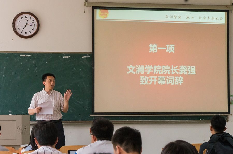 在会议的一开始,文澜学院院长龚强上台致辞。他首先代表学院向所有获奖学生表示祝贺,对大家一年来的优秀成绩表示肯定,尤其是在文体活动和学术科研活动方面有历史突破,希望同学们再接再厉,再创辉煌;其次,学院将会一如既往支持学生活动,从人财物等方面为每一个有梦想有才华敢有激情的同学创造最好的平台,让同学尽情施展才华;最后,鼓励同学们到更高的平台展现自己,希望文澜学生能以高标准、严要求对待自己,积极到更高的平台去展现自己、证明自己,提高文澜的社会认可度和知名度。今天的颁奖只是一个开始,以后会经常性举办,以激励表现优异的文澜人。