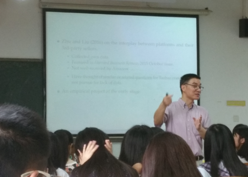 (文澜学院团委记者 贾璐菲)7月3日,文澜学院2016年第一届暑期科研集训营邀请俄克拉荷马大学经济系的刘其宏教授进行了两场讲座:“A Brief Summary of my Research” 和“海外学习与研讨”。刘老师主要研究航空产业、平台市场和双边理论、定价等领域。文澜学院龚强院长、帅杰副教授、高楠老师及其他部分师生参与了讲座。