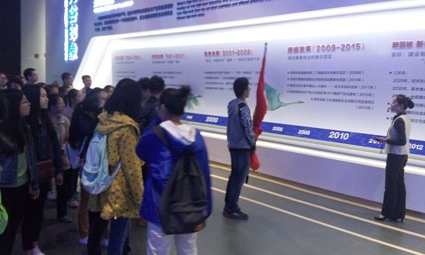 启动仪式前,同学们在讲解员的带领下参观了光谷展示中心,初印象便是一场高科技盛宴,3D的光谷介绍微视频。巨大的立体屏幕占足了大厅的两个墙面,屏幕上炫丽的特效成为全场吸睛的焦点,高速移动的彩色光点令人产生站立不稳的眩晕,武汉光谷的立体模拟图逼真到仿佛身临其境,凌空俯视光谷全景。接下来,讲解员引领着参观光谷展示中心,几步一停,详细具体地介绍光谷近年来的技术创新成果。在光谷,诞生了我国第一根光纤,第一个光传输系统,首台万瓦光纤激光器,全球领先的超大容量、超高速率、超长距离光通信传输技术,全球领先的生物质气化合成液体燃料技术……对于先进的技术和领先的成就,同学们纷纷表示震撼和敬佩。百万大学生看武汉,看到的是大武汉的创新精神和尖端科技。