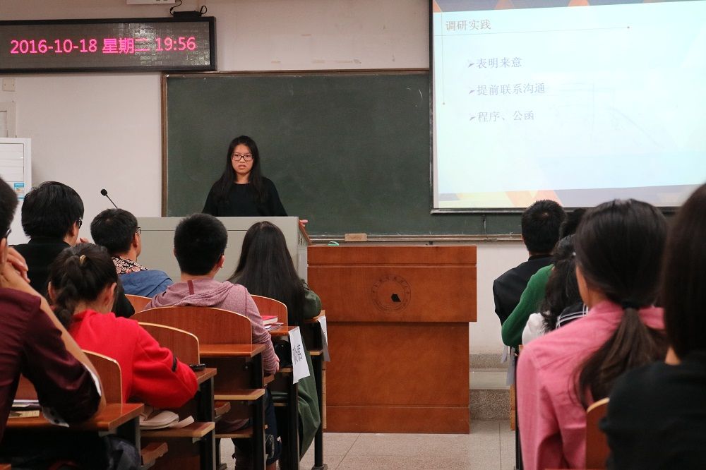 本次社会实践交流会邀请到了来自2014级和2015级的优秀社会实践负责人:2016年校重点立项社会实践筑梦洪湖小分队负责人张启迪、成员刘楠頔,大创国家级立项课题成员朱俐蓉,大创国家级立项课题负责人吴婉莹。四位经验介绍人分别从自身实践经验、课题选择、与导师沟通、与调研地相关部门沟通等方面出发,详细介绍了自身实践过程中总结出的经验教训,并一一回答了新生们提出的相关问题。