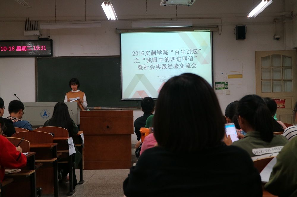 (文澜学院团委记者 贾璐菲)为弘扬党的精神,加深2016级新生对党的理解,文澜学院团委于10月18日晚在文澜楼305教室举办了2016文澜学院“百生讲坛”之“我眼中的四进四信”暨社会实践经验交流会,文澜学院团总支书记余利、院团委负责人及2016级全体新生参加了活动。