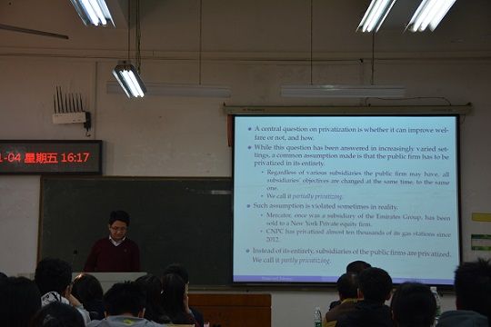 以前的文献都是讨论公有制公司完全私有化的情况,而在实际中,很多情况是仅仅对子公司进行私有化改制。相比无私有化和完全私有化,子公司私有化将更有利于社会福利的提升,尤其当公司技术水平存在较大差距时。这些结论对部分私有化的实际操作有着深刻的指导意义。在一片掌声中,本次讲座圆满结束。