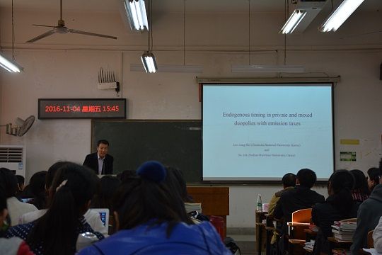 (通讯员 邬楚涵)2016年11月4日,来自日本、韩国等国家和地区的知名经济学领域教授同我院部分老师于文澜楼209教室为我院师生开展了以“博弈论与产业组织”为主题的学术讲座。讲座中第三部分由来自韩国全南国立大学经济学系教授,韩国产业经济学会副会长李相镐教授负责,其主要研究领域有微观经济学、产业组织与环境经济学。论文曾发表在Economics Letters,Economic Modelling,Japan and World Economy,International Review of Economics and Finance,Journal of Regulatory Economics,Contemporary Economic Policy等知名国际期刊。这次他进行学术交流的主题是“Endogenous Timing in Private and Mixed Duopolies with Emission Taxes”