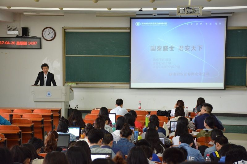 (文澜学院团委记者:周会璇)2017年4月20日,旨在传播证券知识、提升就业技巧的“国泰君安证券知识”讲座在文波楼401教室举行。我校知名校友、国泰君安证券武汉洞庭街营业部总经理熊东平为此次讲座主讲人,文澜学院党总支书记丁奕、团总支书记余利以及文澜学院、统数学院等学院学生参加了此次讲座。