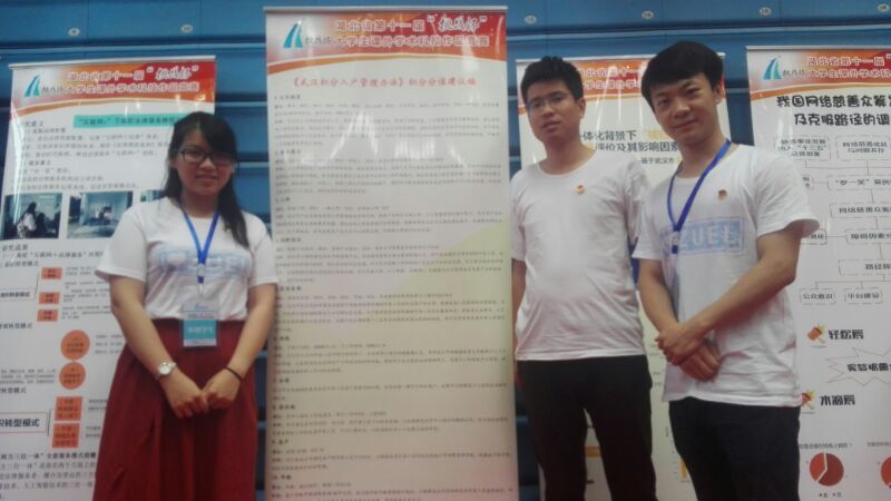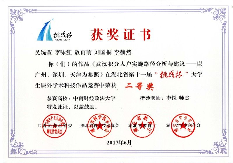 (吴婉莹)6月8日至9日,由团省委、省科协、省教育厅、省学联共同主办,华中农业大学承办的湖北省第十一届“挑战杯”大学生课外学术科技作品竞赛终审决赛暨闭幕式在华中农业大学举行。我院帅杰老师指导、15级学生团队吴婉莹、敖雨萌、李赫然、刘国桐撰写的科研作品《武汉积分入户实施路径分析与建议——以广州、深圳、天津为参照》荣获二等奖。在评委问辩环节中,该成果还作品还获得了评委老师“新颖、扎实”的评价,这是对我院学生人才培养工作的高度赞扬与认可。