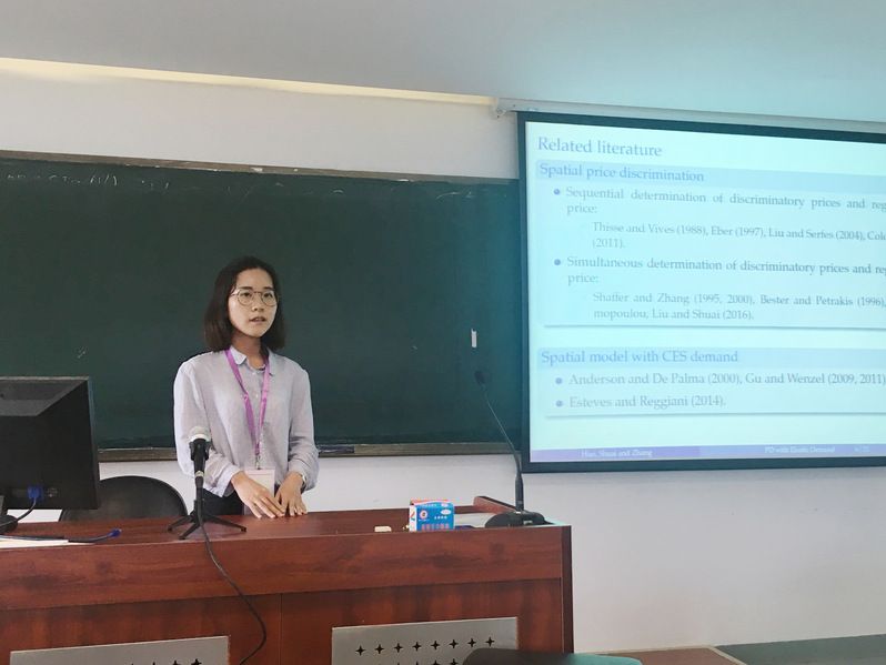 本次会议为期两天,主办方共安排了50个分论坛,在10日下午的Industrial Organization III 分会议上,张鑫同学展示了她与导师帅杰合作的论文《Endogenous Spatial Price Discrimination with Elastic Demand》,受到了在场的专家学者们的赞扬。
