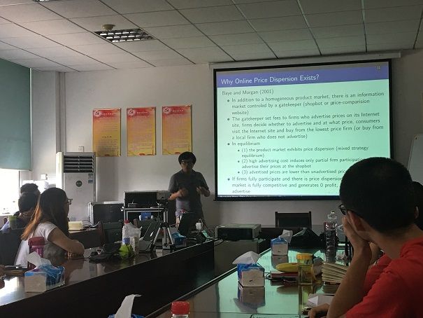7月16日至18日期间,杨老师的讲座主要是围绕“Internet and consumer search”这一主题进行的,本主题的讲座分三场进行。首先,他为同学们简要介绍了互联网相关的经济学现象及简单原理,引出了今天的演讲主题:互联网与消费者搜寻成本。然后,杨老师介绍了新型互联网平台的兴起,例如搜索引擎、线上购物和即时通讯平台等,并总结了这些互联网平台的特点:第一是较低的经济成本,例如互联网平台的数据搜寻与信息搜集成本均非常低;第二个特点是规模经济,杨老师以Facebook为例说明了互联网平台通常具有高固定成本但边际成本较低,最终易形成高度集中化的市场结构;第三个特点是基于历史记录能够对客户进行有效的定位营销;最后是行业创新的速度较快。接着,然后杨恒兴老师给同学们介绍了“一价定律”,他指出一价律在现实生活中并不总是成立的,其原因正是消费者搜寻成本的存在,而互联网降低了消费者的搜寻成本。最后,杨老师介绍了Bertrand模型,并以Bertrand模型为基础为同学们讲解了Varian 1980年的一篇经典文章,该文章以Bertrand模型证明了同质产品可能存在差别定价。