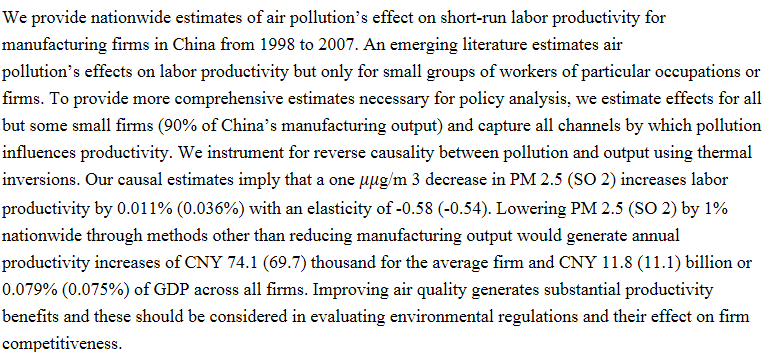 主题 / Topic:Air Pollution and Manufacturing Firm Productivity: Nationwide Estimates for China