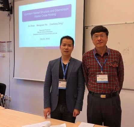 在此次会议上,曾老师汇报了题目为 “Upstream Market Structure and Downstream Cross Holding” 的科研论文。现有的交叉持股研究通常忽略垂直相关市场的影响。这篇论文通过考虑不同的上游市场结构,突出了垂直关联市场的重要性,以及上游市场对下游企业的交叉持股的激励及其社会福利影响。这场报告引起了大家的热流讨论,并收获了参会同行良好的建议和修改意见。同一会场的其它学者的研究也同样关注产业经济的前沿问题:如动态兼并,国企改革,产品定价策略等。曾老师在和这些学者们的深入交流中获得很大的收获。