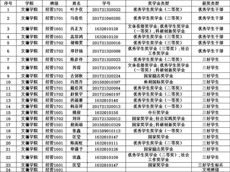 根据学校本科生评奖评优工作安排及相关文件要求,我院于近期开展2017-2018学年本科生先进集体、先进个人、文澜奖学金评选工作。经过学生自主申报--班级评选--学院审核,最终确定匡莹等23同学分别获得先进个人和三好学生,经管1601班获得文明班级荣誉,具体名单如下: