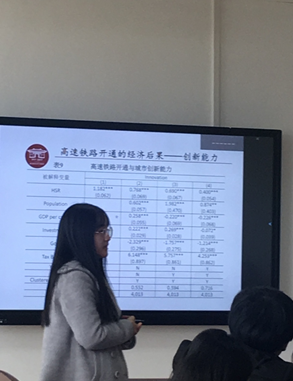 图为武汉大学经济与管理学院在读博士邹甘娜进行了题为“贸易保护下中国宏观经济波动与应对策略研究——基于两国模型分析”的报告。