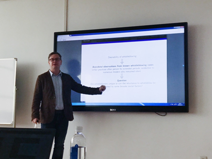 (通讯员:王瑞超)2019年3月15日下午14:00,西交利物浦大学国际商学院Gergely Horvath老师应我院邀请做客文澜学术系列讲座,在文澴楼709开展了主题为“Whistleblowing and Diffusion of Responsibility. An Experiment”的学术讲座。Gergely Horvath 老师主要研究社会网络,劳动经济学,实验和行为经济学,基于代理的建模等方向。已在国际知名经济学 Economics Letters,Journal of Economic Behavior and Organization,The B.E. Journal of Theoretical Economics (Contributions) 等学术期刊发表论文多篇。