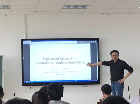 展示过程中,参加讲座的师生们与李涵教授进行了诸多互动问答,例如本文的面板数据不能体现空间距离、生产模型并非结构型等问题。同时李涵教授指出,已有的很多研究仅仅从成本收益的角度去考虑修建高铁带来的财政收支,这是比较狭隘的,因此我们也需要关注高铁的修建带来的社会福利的提升。最后,本次讲座在掌声中圆满结束。