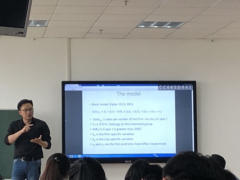 展示过程中,参加讲座的师生们与李涵教授进行了诸多互动问答,例如本文的面板数据不能体现空间距离、生产模型并非结构型等问题。同时李涵教授指出,已有的很多研究仅仅从成本收益的角度去考虑修建高铁带来的财政收支,这是比较狭隘的,因此我们也需要关注高铁的修建带来的社会福利的提升。最后,本次讲座在掌声中圆满结束。
