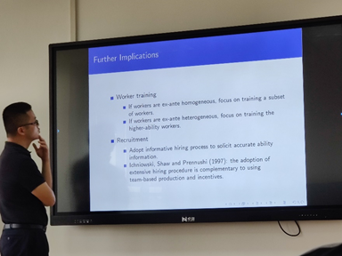 在讲座的过程中,陈教授结合已有文献,对“是否组队工作”和“如何进行组队”两个问题进行了解释:组队工作能够促进知识传播、使成员之间相互督促从而提高工作效率,但同时也存在部分成员可能不劳而获的缺陷;团队效应在异质性强的队伍里的作用更为明显,既有文献从不同角度对正向组队(强配强)和负向组队(强配弱)的优劣进行探讨得出了不同的结论。