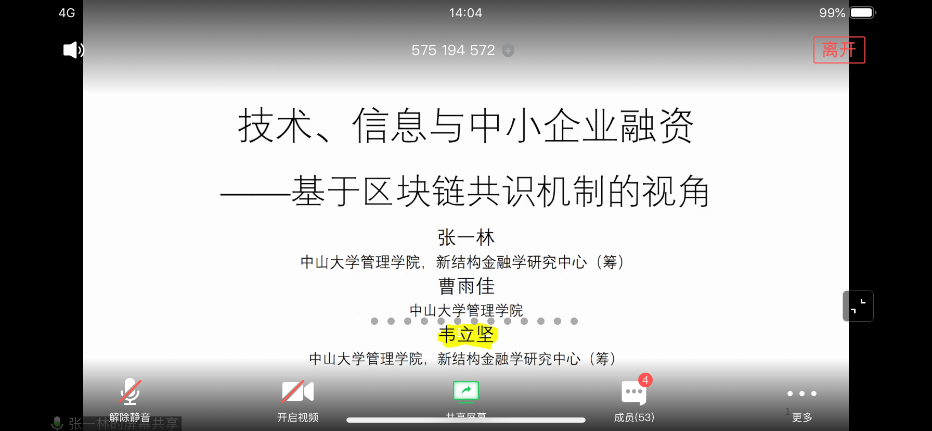 (通讯员:汤昊、芮滢、陈彦伶)2020年3月27日下午两点,文澜学术系列讲座第180期在线上顺利举行。本次讲座的主题是“技术、信息与中小企业融资——基于区块链共识机制的视角”,主讲人是来自中山大学管理学院副教授张一林老师。张老师现为中山大学管理学院“”副教授、博士生导师,研究方向主要是公司资本结构和国家金融结构的理论与实证。讲座由文澜学院的曾辰航老师主持,文澜学院部分教师及学生参与了本次讲座。