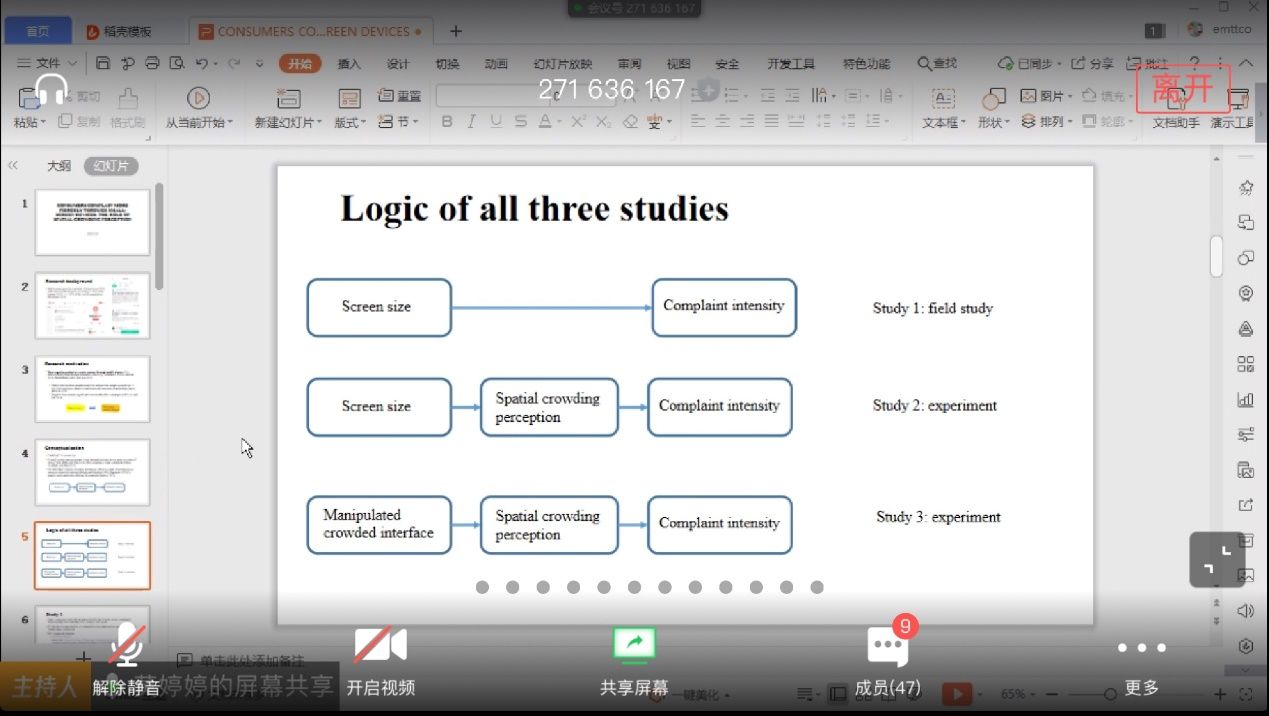 然后,莫老师解释了文章三个研究的逻辑和具体内容。研究一使用电脑和手机作为屏幕大小的代理变量,使用情感词典来作为情绪的度量,回归结果发现是相关的。但是存在替代解释,如当客户不满意时他们更有可能选择移动设备进行投诉,因为他们可以立刻表达愤怒情绪。因此,研究二通过检查潜在影响机制,排除唤醒、感知便利和设备移动性三个潜在影响因素,分别进行了三次实验,结果显示在使用小屏幕时的投诉情绪更加激烈。研究三是通过对于软件界面的不同设计,来判断是否是由于视觉拥挤而造成的投诉情绪激烈。