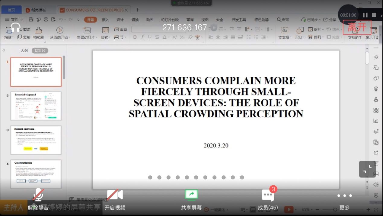 (通讯员:王涵)2020年3月20日下午两点,文澜学院课堂云讲座通过线上平台顺利举行。本次讲座的主题是 “Consumers Complain More Fiercely Through Small-Screen Devices: The Role of Spatial Crowding Perception”,主讲人是文澜学院副教授莫婷婷。文澜学院部分学生参加了本次讲座。