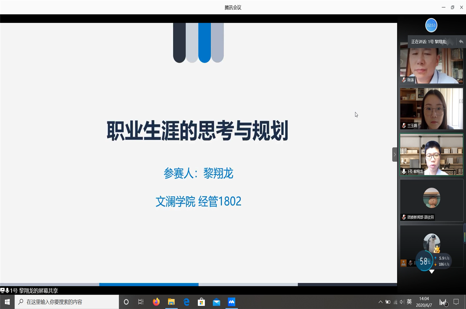 (文澜学院团委记者 叶思诗 邵欣羽)202064-67日,由文澜学院分团委主办的“济世杯”系列就业指导活动之第四届就业创业知识竞赛复赛及决赛通过腾讯会议顺利举办。出席本次比赛复赛的评委老师有文澜学院专任教师吴雷老师、龚玉晶老师和刘惠中老师。在决赛中,学院则邀请到浦发银行武汉分行公司业务部总经理陈涛先生、米兰电竞·(中国区)就业指导研究室副主任兰玉娟老师、文澜学院党委书记彭晓燕老师、文澜学院副教授田贤亮老师以及文澜学院研究生辅导员黄冠老师组成强大的评委团,助力本次比赛。
