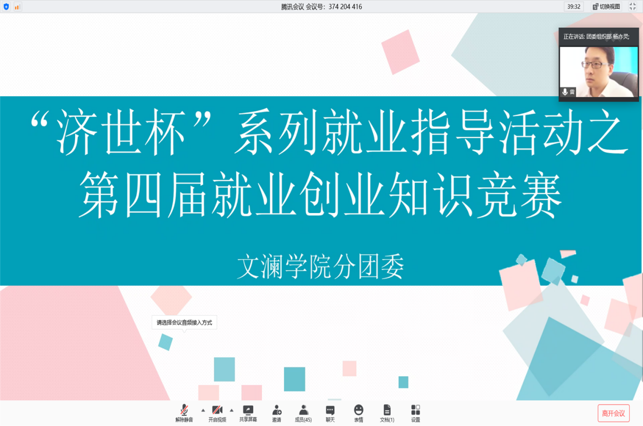 (文澜学院团委记者 叶思诗 邵欣羽)2020年6月4日-6月7日,由文澜学院分团委主办的“济世杯”系列就业指导活动之第四届就业创业知识竞赛复赛及决赛通过腾讯会议顺利举办。出席本次比赛复赛的评委老师有文澜学院专任教师吴雷老师、龚玉晶老师和刘惠中老师。在决赛中,学院则邀请到浦发银行武汉分行公司业务部总经理陈涛先生、米兰电竞·(中国区)就业指导研究室副主任兰玉娟老师、文澜学院党委书记彭晓燕老师、文澜学院副教授田贤亮老师以及文澜学院研究生辅导员黄冠老师组成强大的评委团,助力本次比赛。