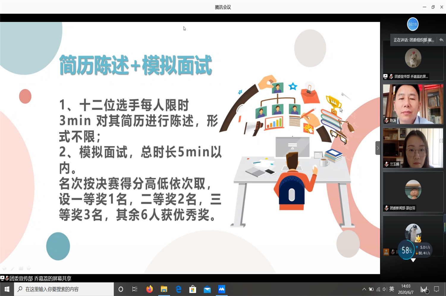 于6月7日举行的决赛则主要分成两个板块:简历介绍和模拟面试。12名参赛选手通过PPT的形式对自己的优异成绩和丰富经历进行了精彩的介绍,同时展望了自己的职业生涯,展现了优秀青年的活力。