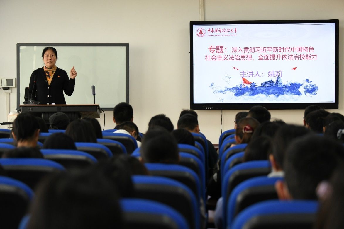 “习近平新时代中国特色社会主义法治思想有着丰富的理论层次和体系结构。”紧接着,姚莉为同学们讲解了习近平新时代中国特色社会主义法治思想的理论结构,并对习近平新时代中国特色社会主义法治思想进行了提炼和深入阐释。她以中国法治发生深刻变化的实例说明了法治建设的重要意义,要求同学们树立对中国特色社会主义法治的道路自信、理论自信、制度自信、文化自信。