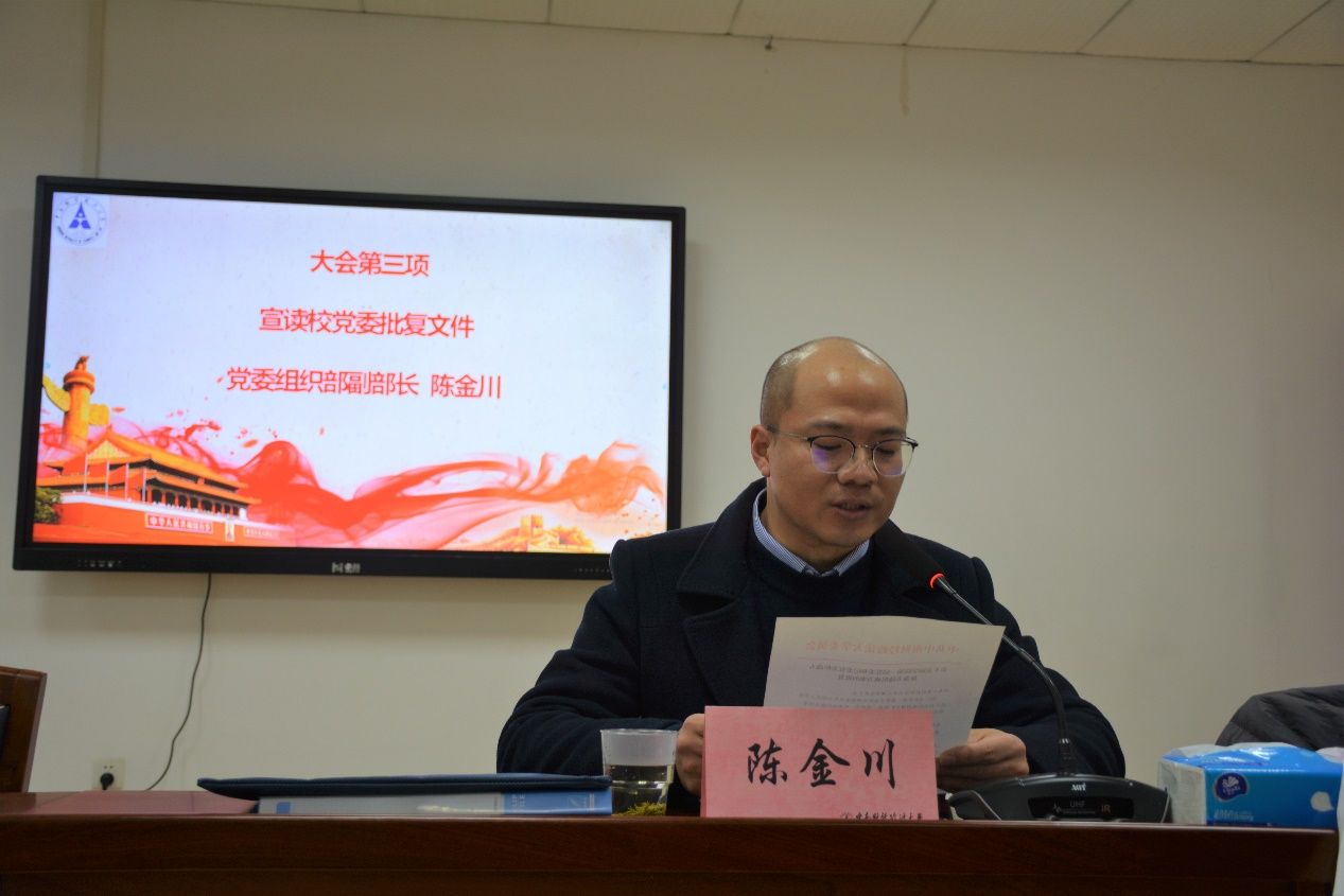在清点到会人数、确认会议有效后,大会在庄严的国歌声中拉开帷幕。随后,由校党委组织部副部长陈金川同志宣读《关于文澜学院党委“两委”组成人员候选人预备人选组成方案的批复》。