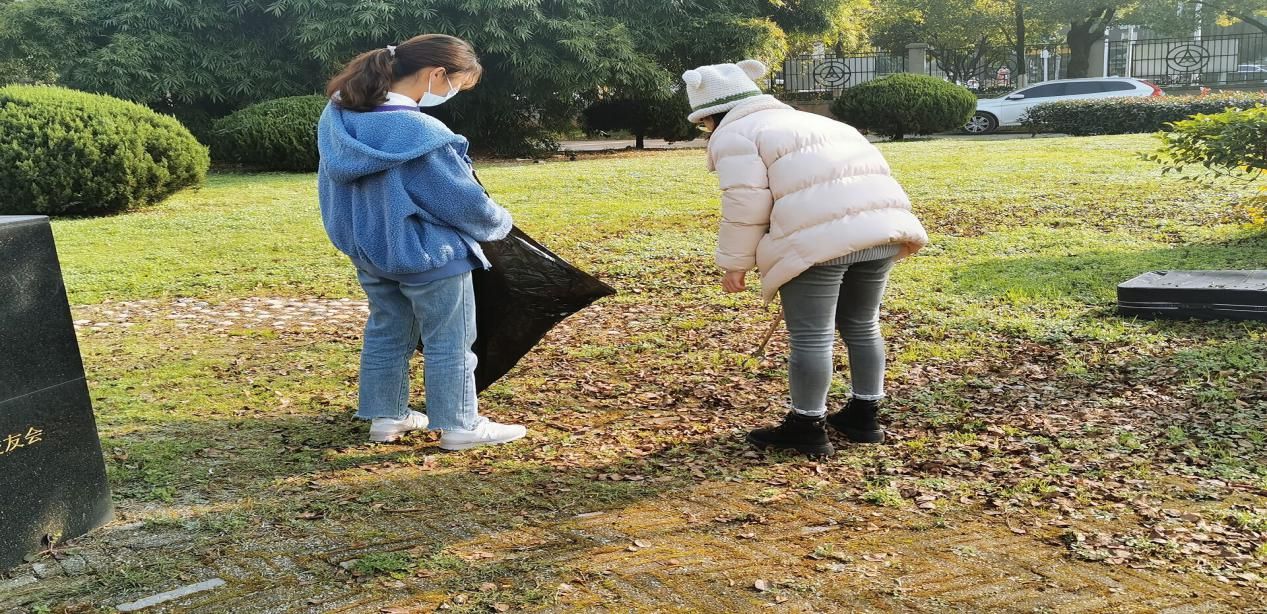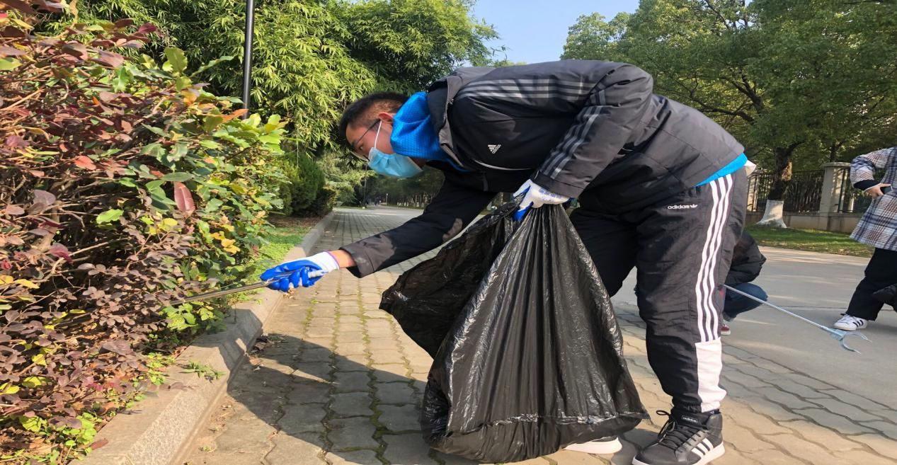 同学们领取打扫工具之后,前往负责区域进行清扫工作。有些同学单独行动,带着麻布手套,左手拎一个黑色的大垃圾袋,右手拿着捡垃圾的钳子进行垃圾清理任务;有些同学则是两两一组,一个负责捡垃圾,另一个在一旁撑开袋子,仔细认真的进行打扫。