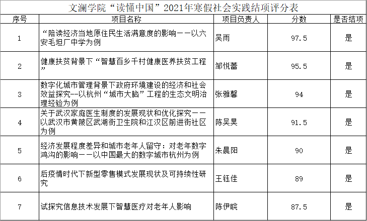 根据校团委下发的《关于组织开展“读懂中国”2021年寒期社会实践活动的通知》等相关文件要求,学院积极组织动员学生开展寒假社会实践调研活动。此次共收到2021年寒假社会实践调研成果7篇,专家组本着公平、公开、公正的原则对调研成果进行结项评审,现将评审结果公布如下: