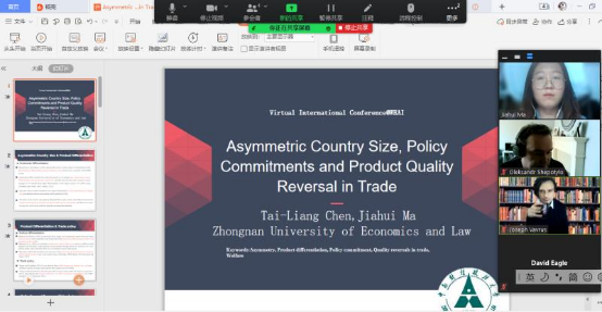 文澜学院19级硕士研究生马佳慧同学在世界标准时间(UTC)2021年3月17日16点(北京时间2021年3月18日0点),参加了美国西部经济学会2021年线上国际会议,并在分会场17, “Shocks, Asymmetry and Debt”做了题为“Asymmetric Country Size, Policy Commitments and Product Quality Reversal in Trade” (合作者:文澜学院陈泰良副教授)的学术报告。本分会场的参与学者分别来自中国New York University Shanghai,法国University Of Paris 1 – Sorbonne,卡达尔Qatar University,美国University of Redlands, 英国Aston University。他们各自分享了相关领域的前沿研究。