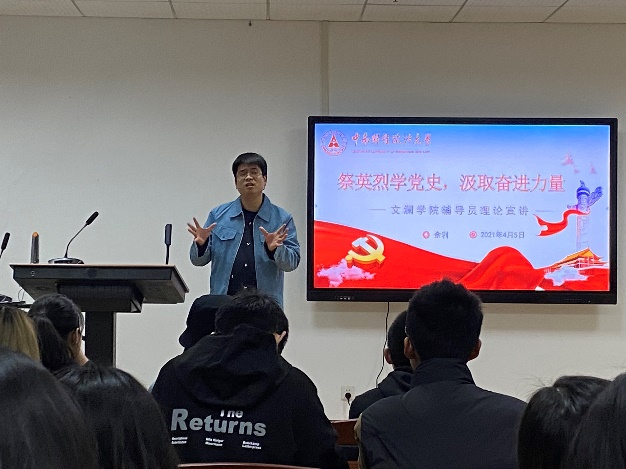 (通讯员:闵义媛)2021年4月5日19:00,文澜学院在文澴楼709教室举行了一场别开生面的主题班会——党史学习教育辅导员理论宣讲。文澜学院学办主任、辅导员余利老师在班会上以《祭英烈学党史,汲取奋进力量》为主题作报告,加强新时代大学生爱国主义教育和党史学习教育,引导学生学习革命先烈精神,凝聚奋进新时代实现民族复兴的磅礴伟力。文澜学院2020级全体成员参加宣讲会。这标志着我院辅导员理论宣讲团宣讲工作拉开帷幕。