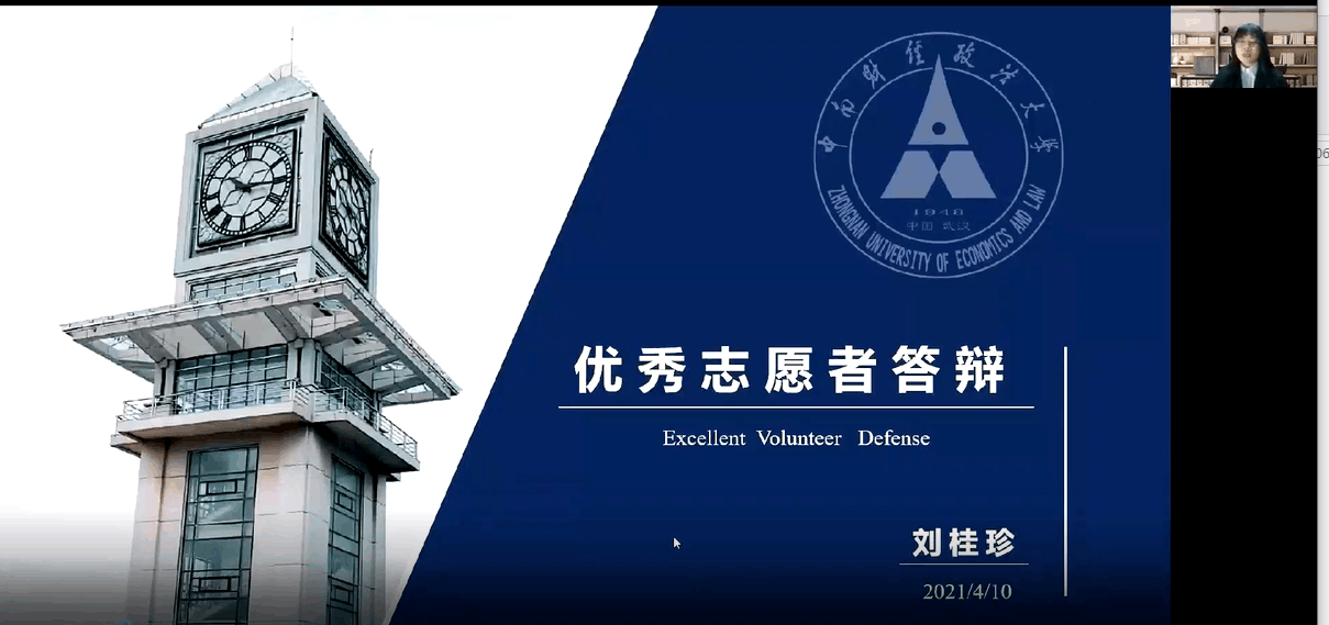 (通讯员/殷茵 刘千惠)2021年4月10日9:00,文澜学院2020-2021学年共青团工作校级“五四”综合表彰推优答辩会议以腾讯会议形式顺利开展。参加本次答辩会的评委有文澜学院学生工作办公室主任余利老师、文澜学院团委书记刘千惠老师和文澜学院研究生辅导员黄冠老师。共42名同学参与本次答辩。