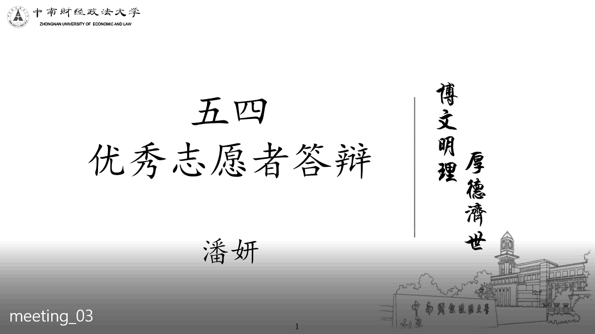 本次表彰以模范专(兼)职团干(学生)、优秀学生干部、优秀共青团员、优秀志愿者为答辩项目。答辩形式为学生结合演示文稿进行时长为两分半的自我陈述。评委老师将结合申报材料和学生的答辩内容进行综合审议和评分。