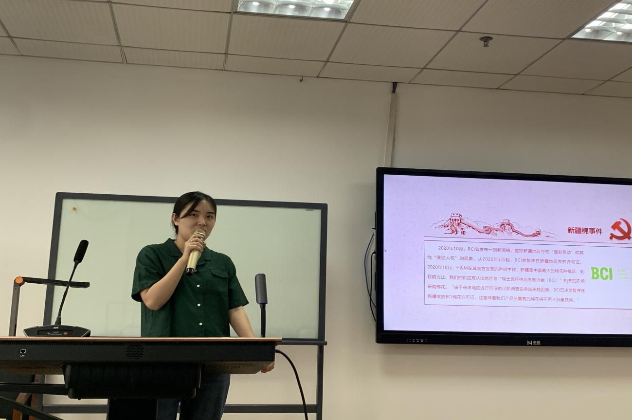 课程伊始,刘千惠老师从前不久在网络上引起热议的新疆棉花事件讲起,通过中国在本次事件中的霸气回应,展现中国人民在党的领导下不断坚定道路自信、理论自信、制度自信、文化自信。今年是五四运动102周年,刘老师与同学们一起走进史实,共同分析五四运动与中国共产党的建立的意义和二者间紧密关系。