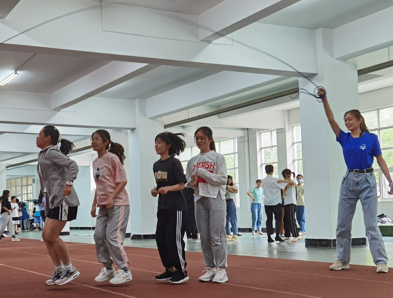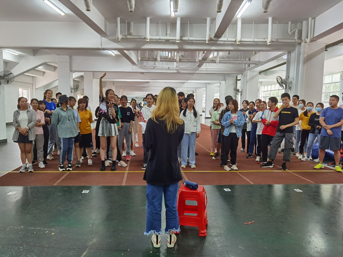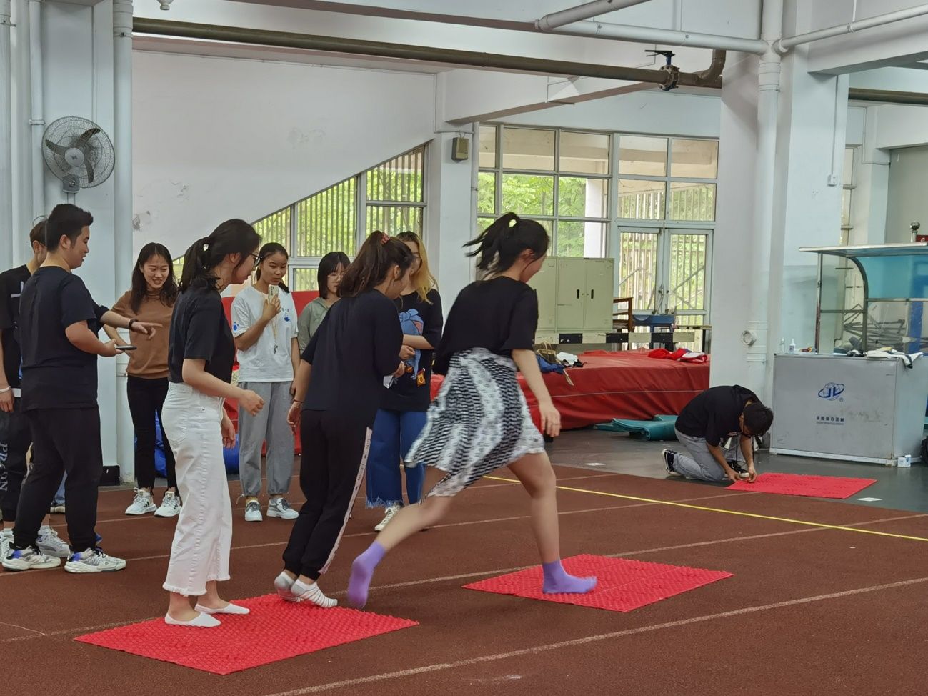 第二个项目是“风雨同舟”。参赛队员用指压板向前铺路并踩在指压板道具上前进。在速度与连贯性的取舍中,崔馨元同学带领的“慈老师,林崔张杨王想加入篮球队”略胜一筹,获得了第二个项目的胜利。