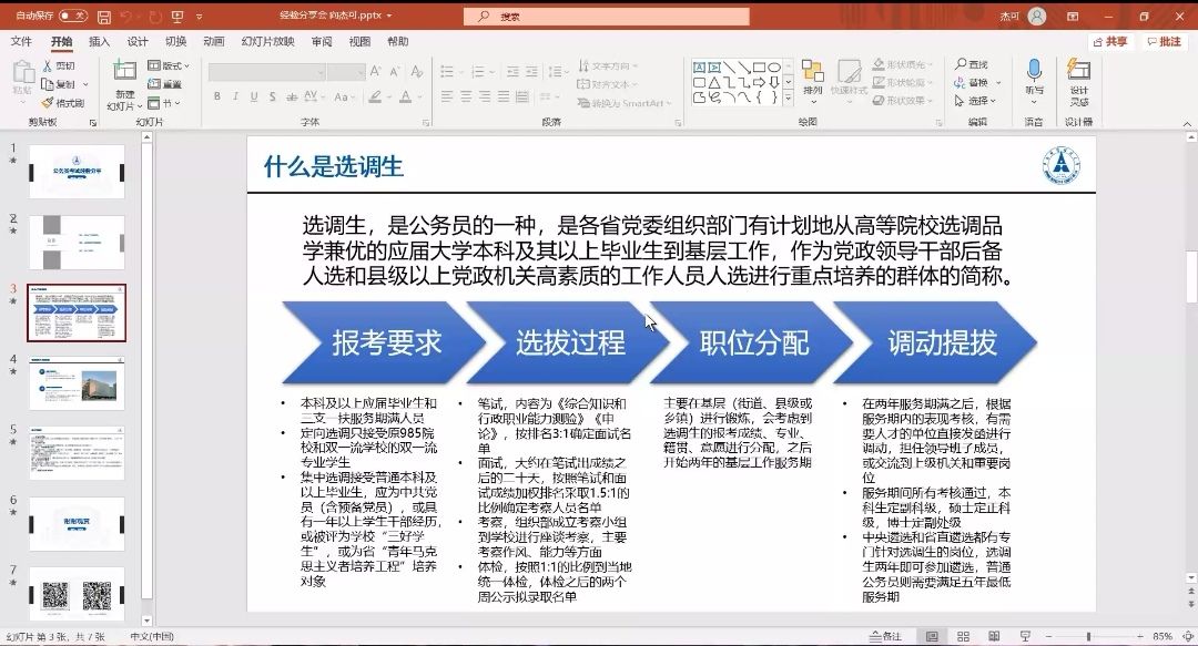 向杰可同学成功考取湖北省宜昌市选调生,她从什么是选调生,公务员考试现状以及有关信息的搜集,良好的心态,耐心、坚持、努力的学习态度,自始至终的重视以及身体健康的重要性五个方面分享了其公务员考试的经验。为同学们解释了有关公务员这一职业的常见误区并使同学们对公务员有了更深层次的了解。
