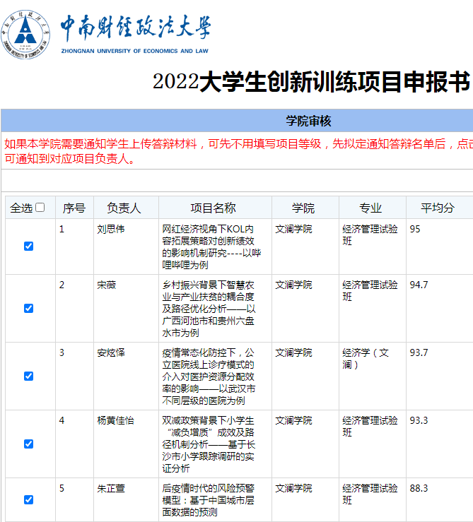 文澜学院2022年大学生创新训练项目申报工作已经结束,经学生自主申报、专家评审、学院终审,现将拟推荐立项项目评选结果公布如下: