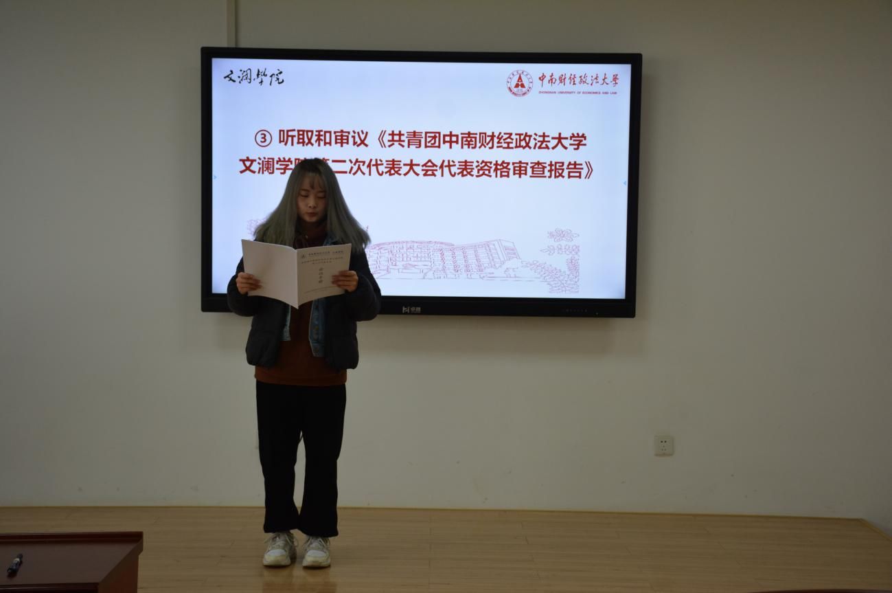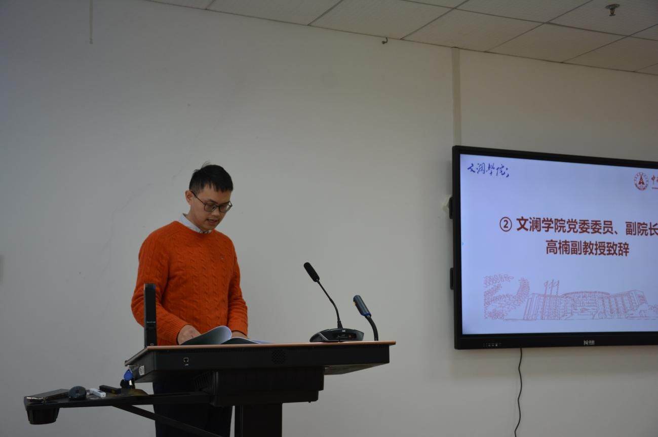 在清点到会人数、确认会议有效后,大会在庄严的团歌声中拉开帷幕。首先,文澜学院党委委员、副院长高楠副教授致辞。高楠副教授在讲话中充分肯定院共青团在过去五年所完成的工作,共青团组织高举中国特色社会主义伟大旗帜,同全院师生勠力同心筑强院之梦。同时,他向学院共青团员提出以下希望:一是锤炼思想、锻炼党性;二是努力学习、刻苦钻研;三是脚踏实地、热心奉献。希望同学们可以做有思想、有本领、有担当的新时代青年。
