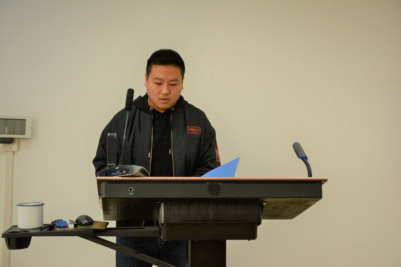 国歌声毕,帅杰教授致辞。他表示,研究生会的成立建立起了学生与学院联系更为紧密的桥梁,方便、促进了学生与学院更好的沟通。同时,他也鼓励广大研究生积极配合研究生会的工作、积极参与研究生会事务,并在研究生会的工作与活动中提升自己。最后,帅杰教授对往后研究生的学术科研活动做出了展望,并为本次研究生大会以及日后学院研究生工作送上了祝福。