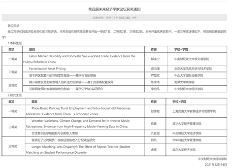 (通讯员:郇丰宁、周思琪)文澜学院18级本科生郇丰宁同学于2021年12月4日参加了第四届“未来经济学家论坛”,并做了题为“Labor Market Flexibility and Domestic Value-added Trade: Evidence from the Hukou Reform in China”(合作者:文澜学院王文晓老师)的论文汇报,获得本科生组优秀论文一等奖。未来经济学家论坛是由中央财经大学经济学院、中国经济学年会、中国青年经济学家联谊会联合主办的一项全国性学术活动。论坛旨在为未来有志于从事经济学研究的全国高校在校学生提供一个高层次的交流平台,鼓励思想争鸣、学术创新,挖掘青年科研人才。