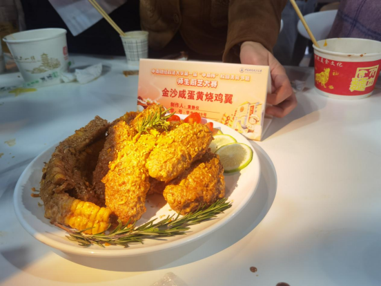 比赛当天,全校各学院超过50名本科生和研究生参与了活动,文澜学院2020级研究生共同协助完成参赛作品的制作,最终菜品《金沙咸蛋黄烧鸡翼》斩获学生组一等奖的殊荣。