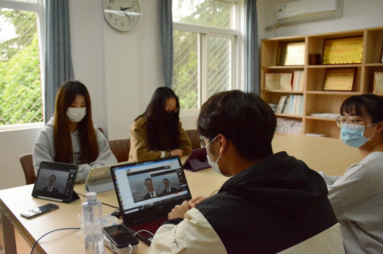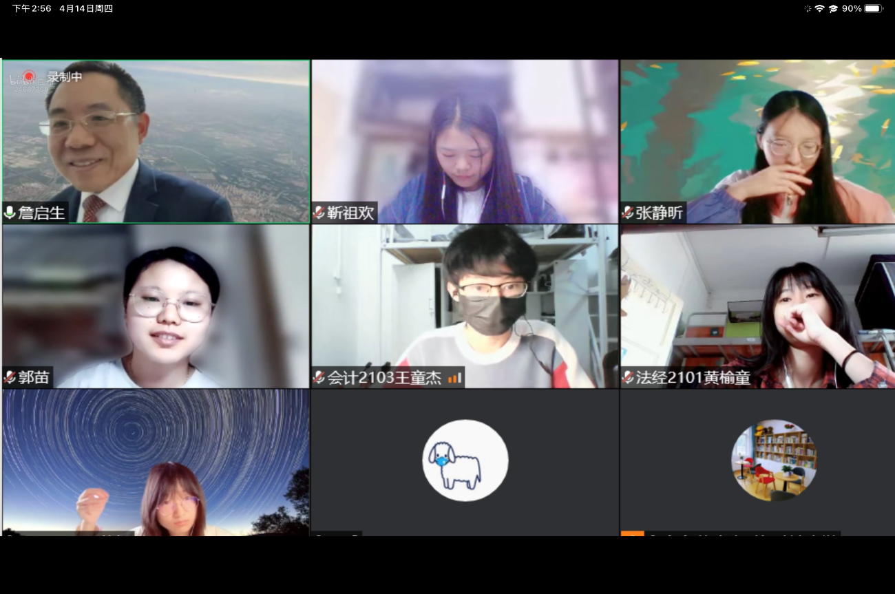 讲座第二部分,詹教授邀请所有心理委员打开线上视频参与到情景剧的构思和创作中,并鼓励数位同学进一步完善情景剧的脉络。过程中,詹教授还不断邀请更多同学参与其中,让他们有更切身的感受。最后,他表扬了同学们的即兴发挥,鼓励同学们继续参与培训。