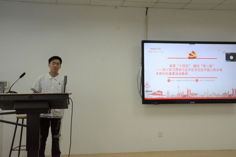 活动第二项,深入学习习近平总书记在中国人民大学考察时的重要讲话精神。考察时,习近平总书记强调“坚持党的全面领导传承红色基因扎根中国大地,走出一条建设中国特色世界一流大学新路”,并寄语新时代青年不负韶华,不负人民,在青春赛道上奋力奔跑。随后,党员代表分享了学习心得,立志成长为堪当民族复兴重任的时代新人,把为祖国为人民的抱负贯穿到学业、事业当中。