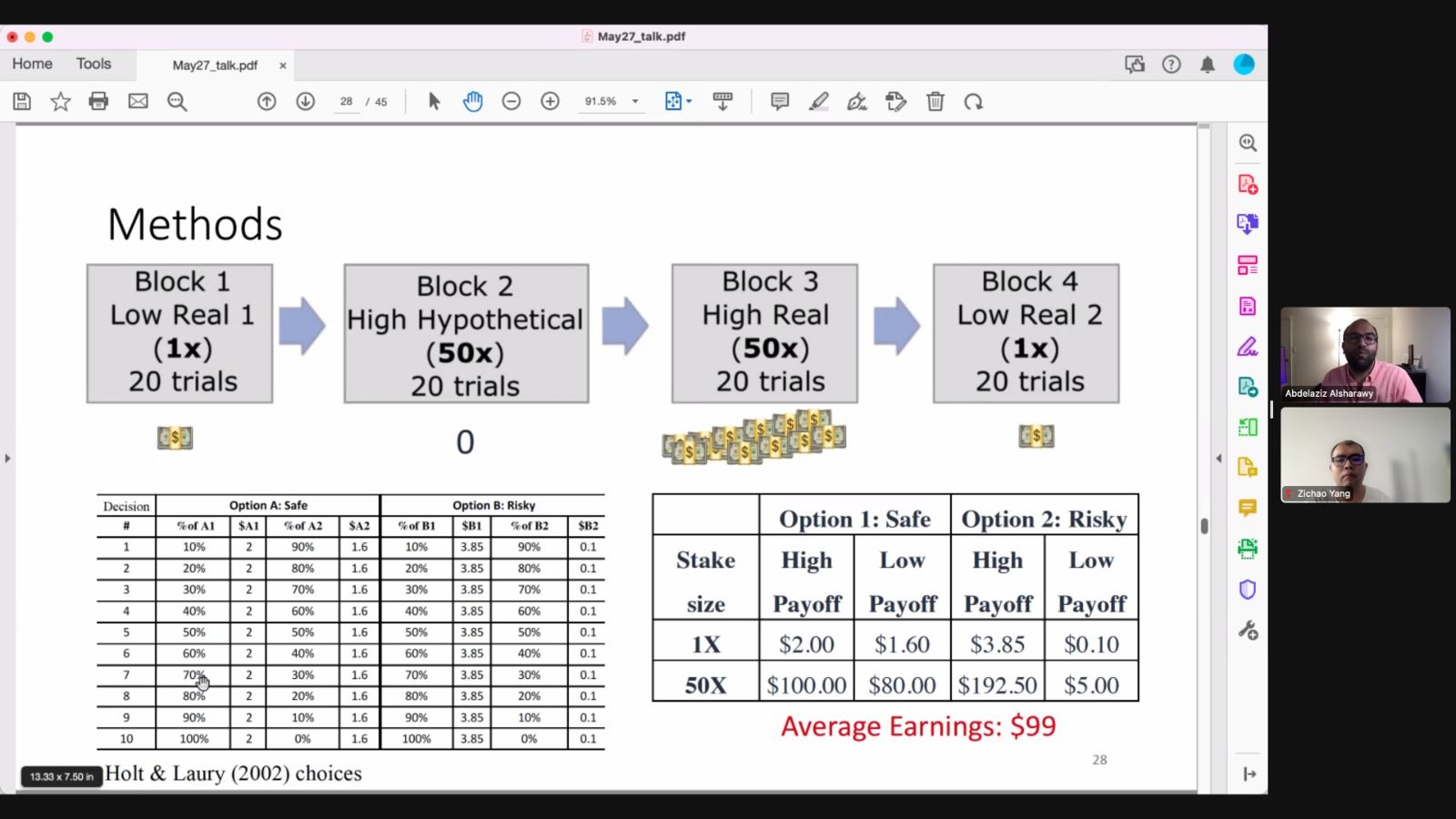 Dr. AlSharawy及其合作者通过构建 arousal-modulated Attentional Drift Diffusion model (aADDM) 来研究唤醒和注意力之间的相互作用。通过皮肤电导、心率和瞳孔大小的衡量,实验发现在较高真实回报时,参与者会变得更厌恶风险并表现出更大的生理唤醒。实验还发现在高实际风险下与虚拟风险的不同注意力模式:在实际高风险的情况下,参与者对高风险选项的较高回报的关注明显更少,而对安全选项的回报的关注明显更多。研究发现,在高实际风险下,增加的风险厌恶与增加的实验前唤醒水平和注意力的改变有关。