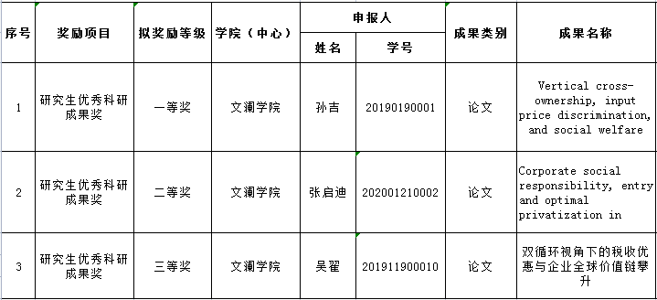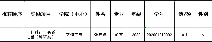 根据《关于开展2022年研究生科研与实践奖励工作的通知》要求,经个人申请,学院专家评审,现将我院2022年研究生科研与实践优秀成果奖一等奖推荐名单、优秀成果奖二等奖和三等奖获奖名单、十佳科研与实践之星推荐名单如下: