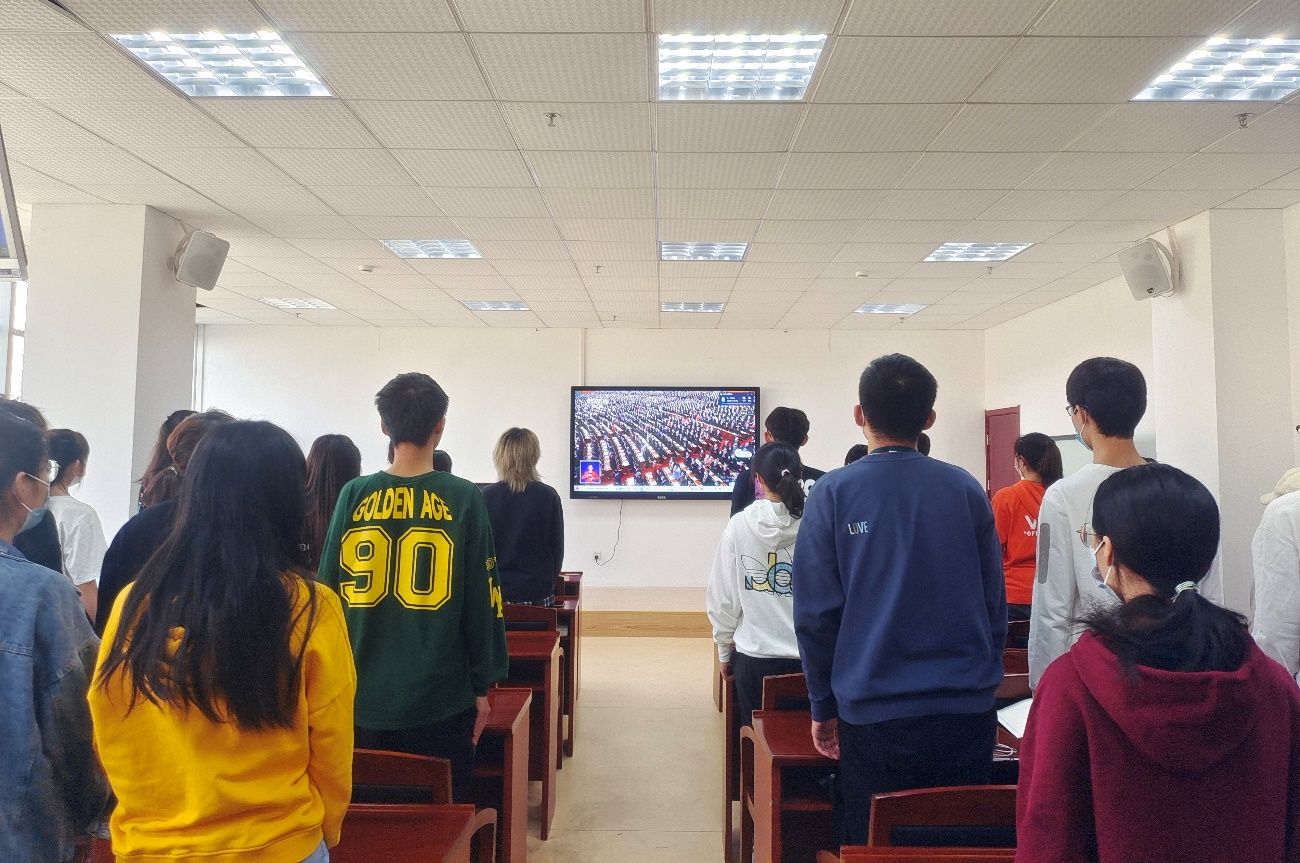 上午10时,中国共产党第二十次全国代表大会在北京人民大会堂开幕。跟随直播,全体同学庄严合唱国歌,并以崇敬的心情向已故老一辈无产阶级革命家与先烈们默哀。